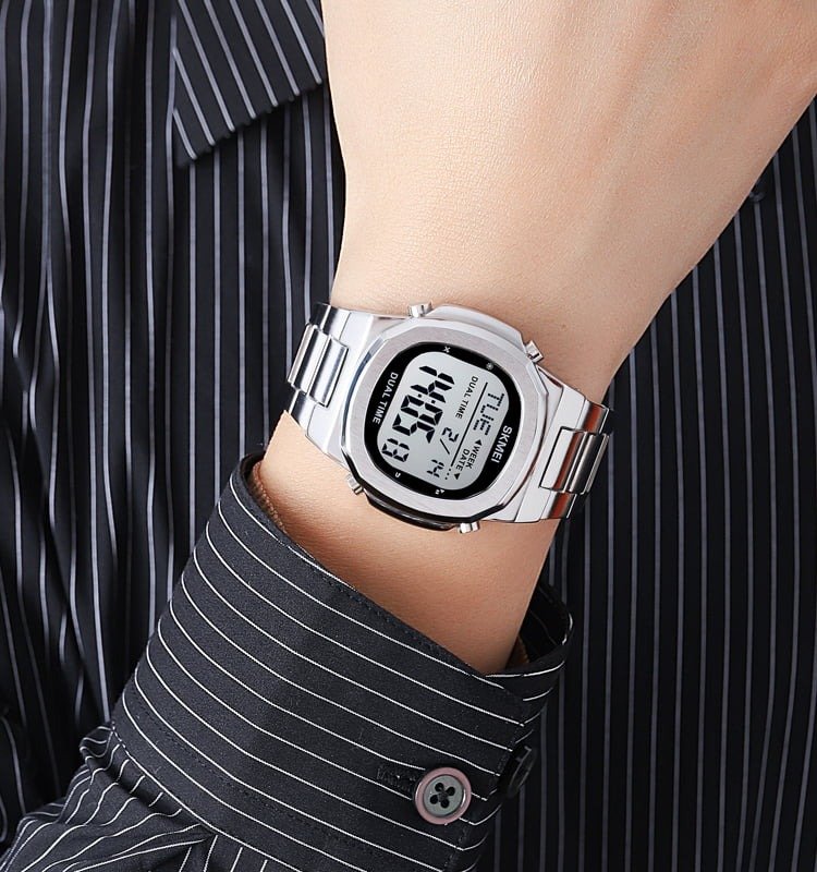 ⌚ SKMEI 2004 – Digital Dual Time Watch ⚙️ Movement: Digital⚖️ Weight: 97.4g🔍 Crystal: Glass🧱 Case: Zinc Alloy🔗 Band: Stainless Steel🔒 Buckle: Stainless Steel💧 Waterproof: 30M📐 Case Size: 42.4 × 47mm📏 Thickness: 10.9mm📎 Band Width: 17mm📏 Watch Length: 200mm ✨ Functions:🕐 Dual Time (2 Time Zones) | ⏱️ Chrono | ⏰ Alarm📅 Date & Week | 🔦 EL Light⏳ Countdown Timer | 🕐 12/24 Hour