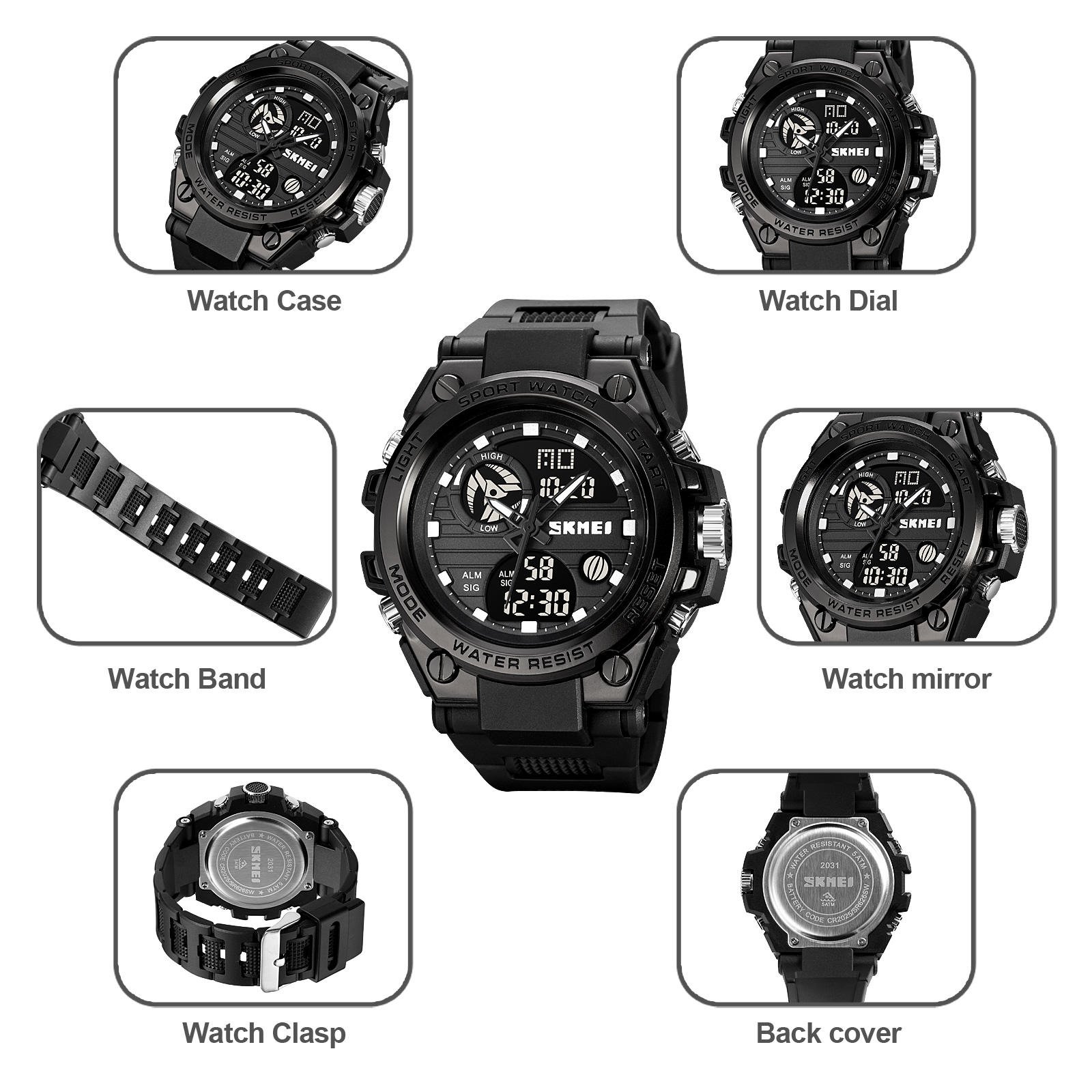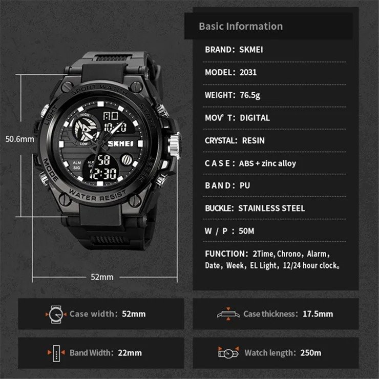 ⌚ SKMEI 2031 – Rugged Digital Sports Watch ⚙️ Movement: Digital⚖️ Weight: 76.5g🔍 Crystal: Resin🧱 Case: ABS + Zinc Alloy🔗 Band: PU (Rubber)🔒 Buckle: Stainless Steel💧 Waterproof: 50M📐 Case Size: 52 × 50.6mm📏 Thickness: 17.5mm📎 Band Width: 22mm📏 Watch Length: 250mm ✨ Functions:🕐 Dual Time (2 Time Zones) | ⏱️ Chrono⏰ Alarm | 📅 Date & Week🔦 EL Light | 🕐 12/24 Hour