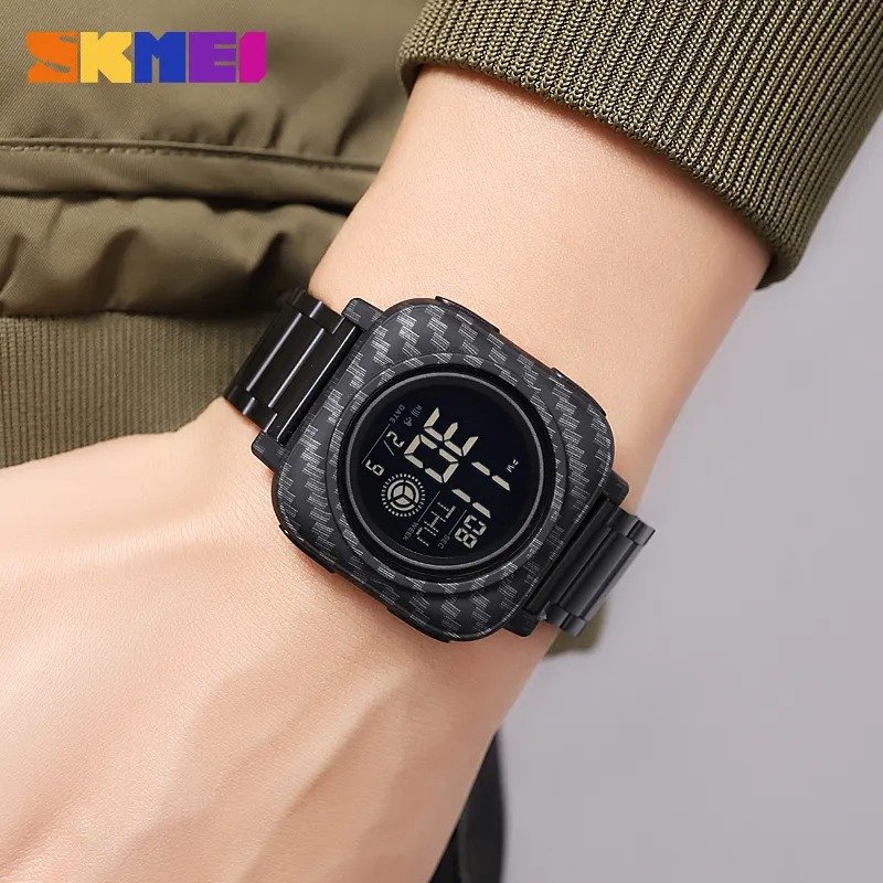 ⌚ SKMEI Square Digital Watch – Carbon Fiber Design ⚙️ Movement: Digital🔲 Dial Shape: Square🔗 Band: Stainless Steel💧 Waterproof: 50M ✨ Functions:🕐 Dual Time (2 Time Zones) | ⏱️ Chrono⏰ Alarm | 🔦 EL Light📅 Date & Week | 🔔 Snooze (SNZ)