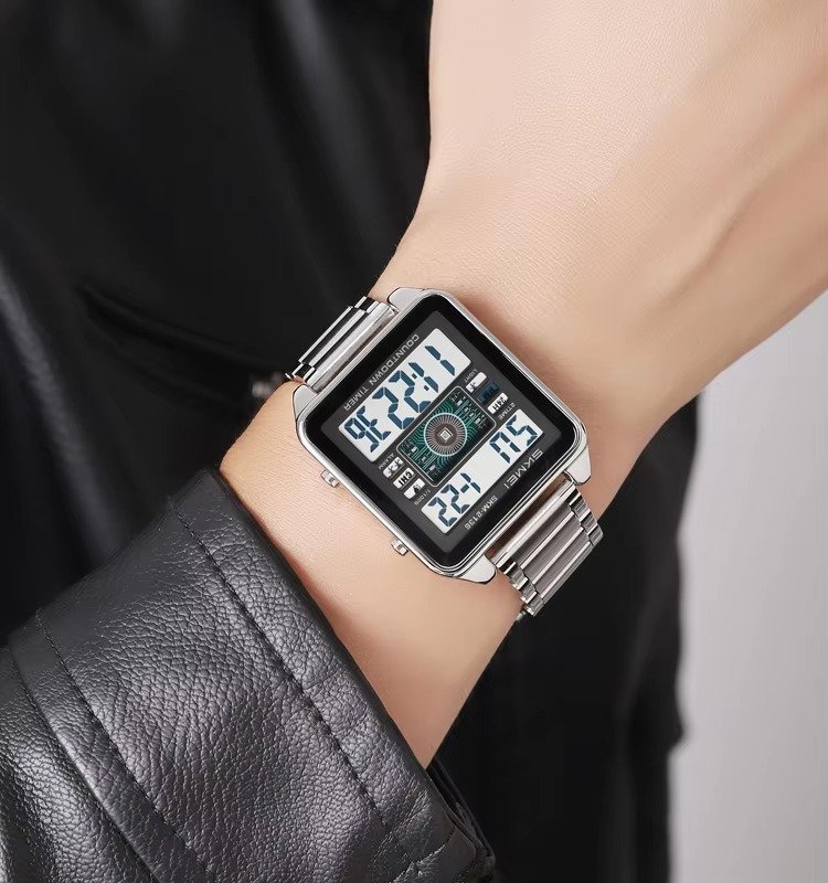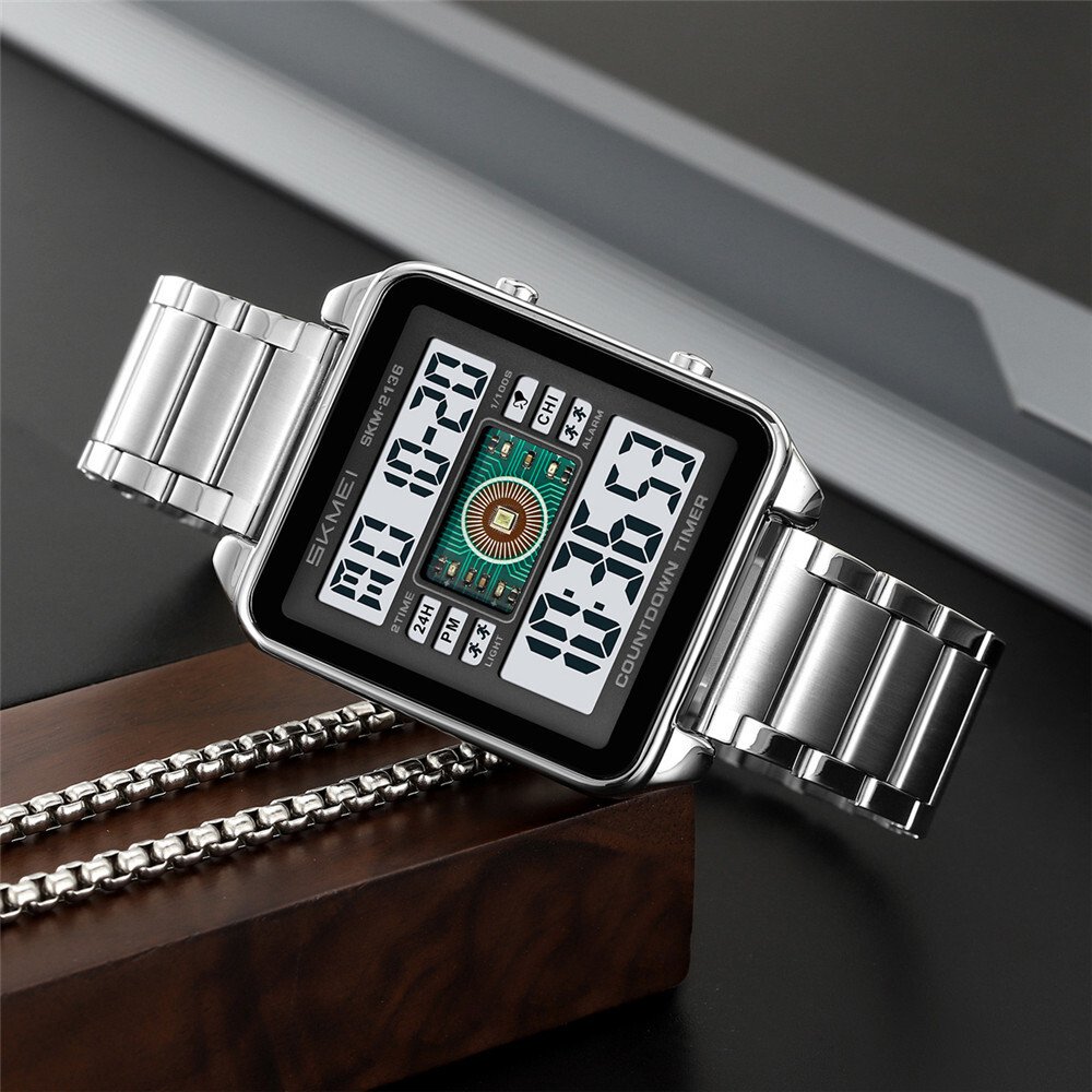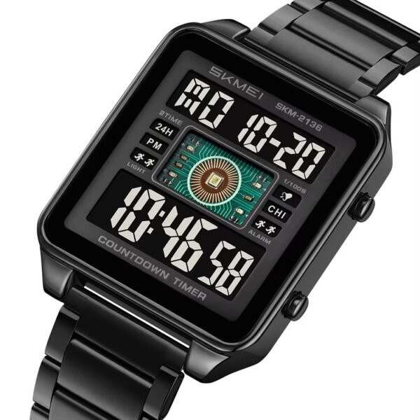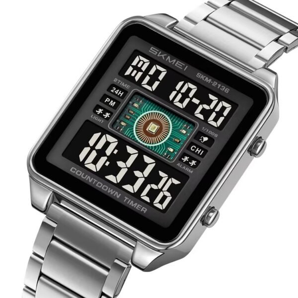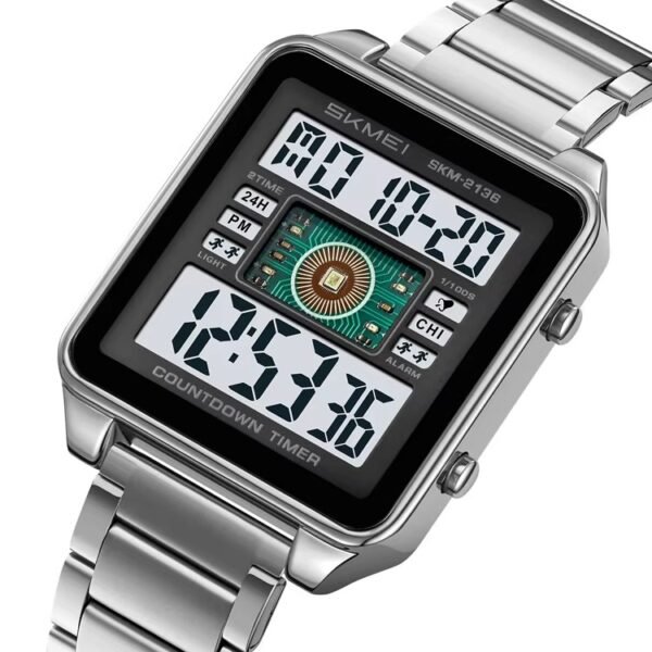 ⌚ SKMEI 2136 – Square Digital Countdown Timer Watch ⚙️ Movement: Digital⚖️ Weight: 110.5g🔍 Crystal: Glass🧱 Case: Zinc Alloy🔗 Band: Stainless Steel🔒 Buckle: Stainless Steel💧 Waterproof: 30M📐 Case Size: 38 × 48.8mm📏 Thickness: 10.7mm📎 Band Width: 19.8mm📏 Watch Length: 220mm ✨ Functions:🕐 Dual Time (2 Time Zones) | ⏱️ Chrono⏰ Alarm | 📅 Date & Week💡 LED Light | ⏳ Countdown Timer🕐 12/24 Hour