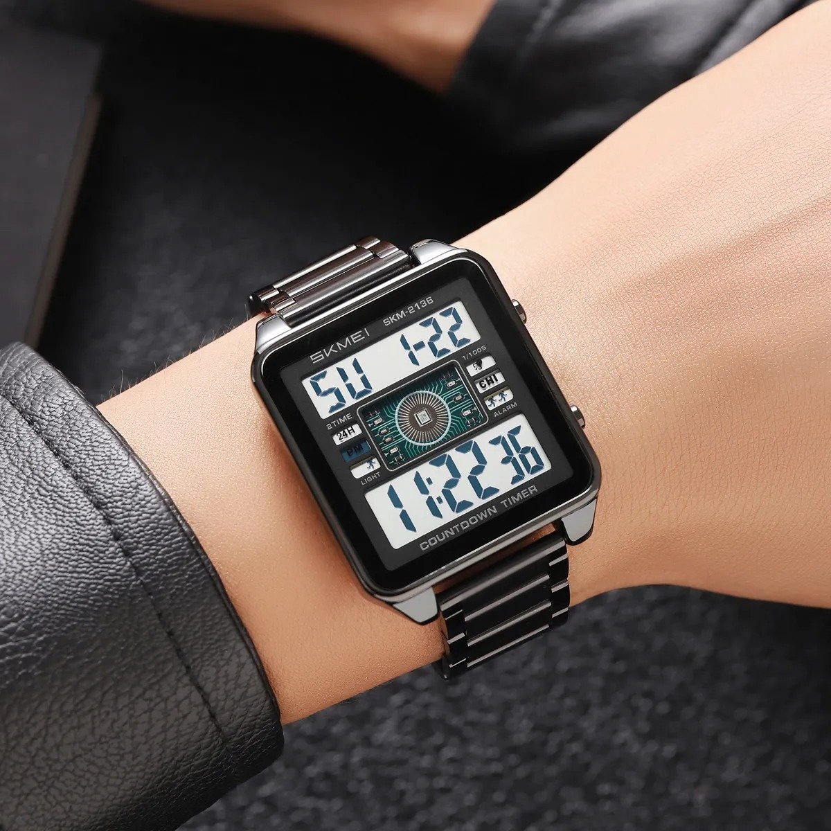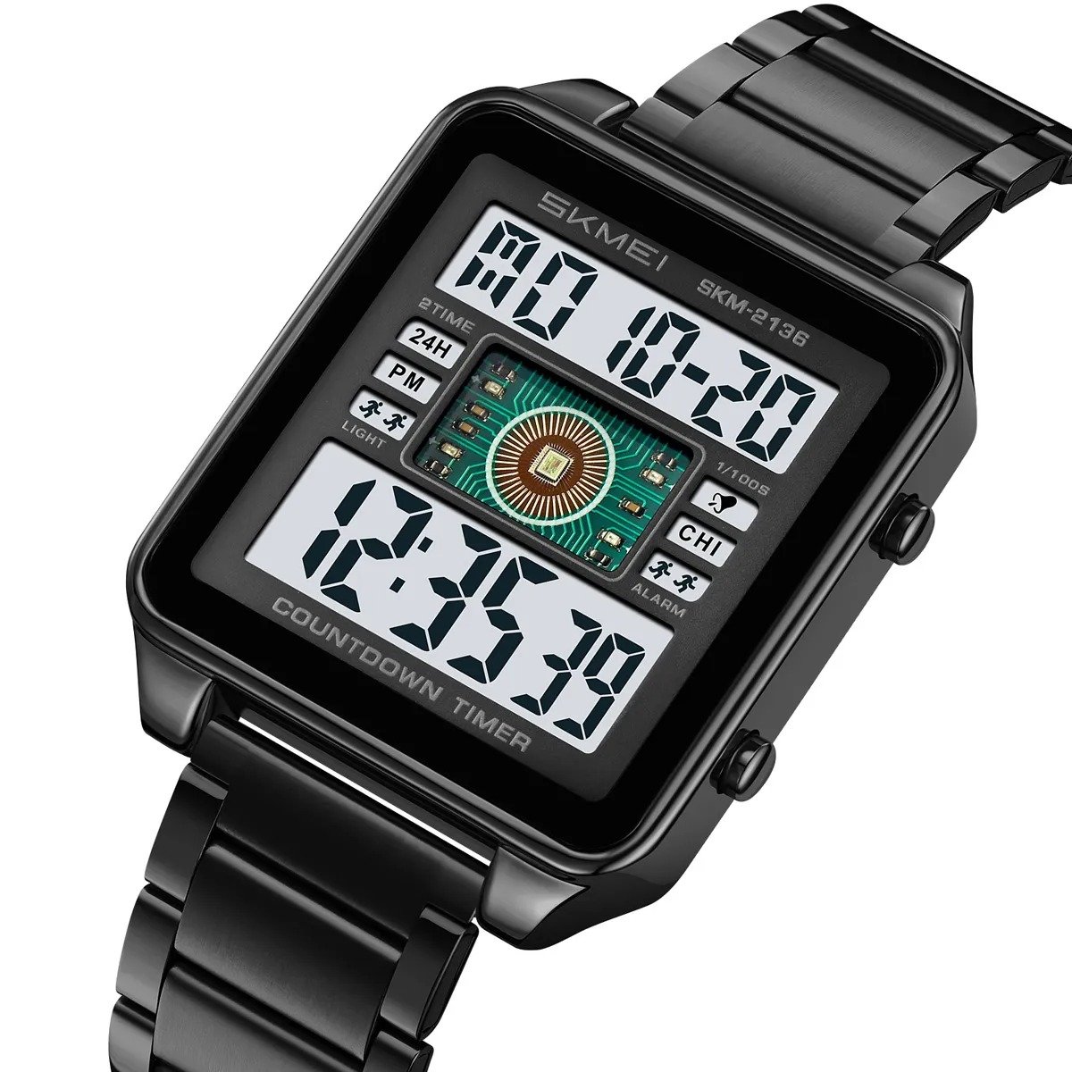 ⌚ SKMEI 2136 – Square Digital Countdown Timer Watch ⚙️ Movement: Digital⚖️ Weight: 110.5g🔍 Crystal: Glass🧱 Case: Zinc Alloy🔗 Band: Stainless Steel🔒 Buckle: Stainless Steel💧 Waterproof: 30M📐 Case Size: 38 × 48.8mm📏 Thickness: 10.7mm📎 Band Width: 19.8mm📏 Watch Length: 220mm ✨ Functions:🕐 Dual Time (2 Time Zones) | ⏱️ Chrono⏰ Alarm | 📅 Date & Week💡 LED Light | ⏳ Countdown Timer🕐 12/24 Hour