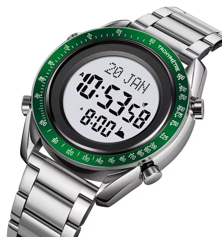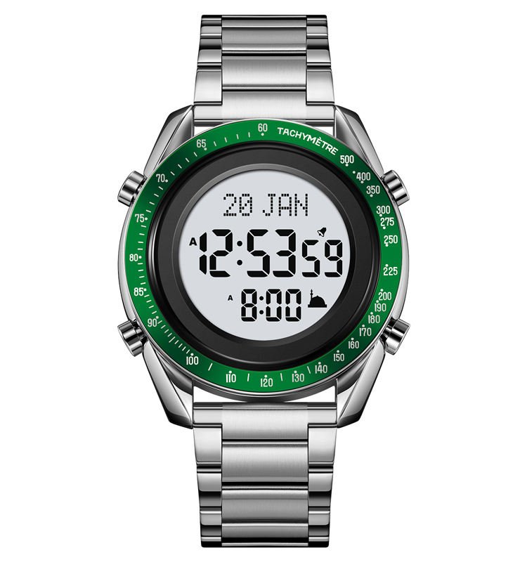 SKMEI – 2143 – Qibla Azan Time Reminder Prayer Watch – silver/green