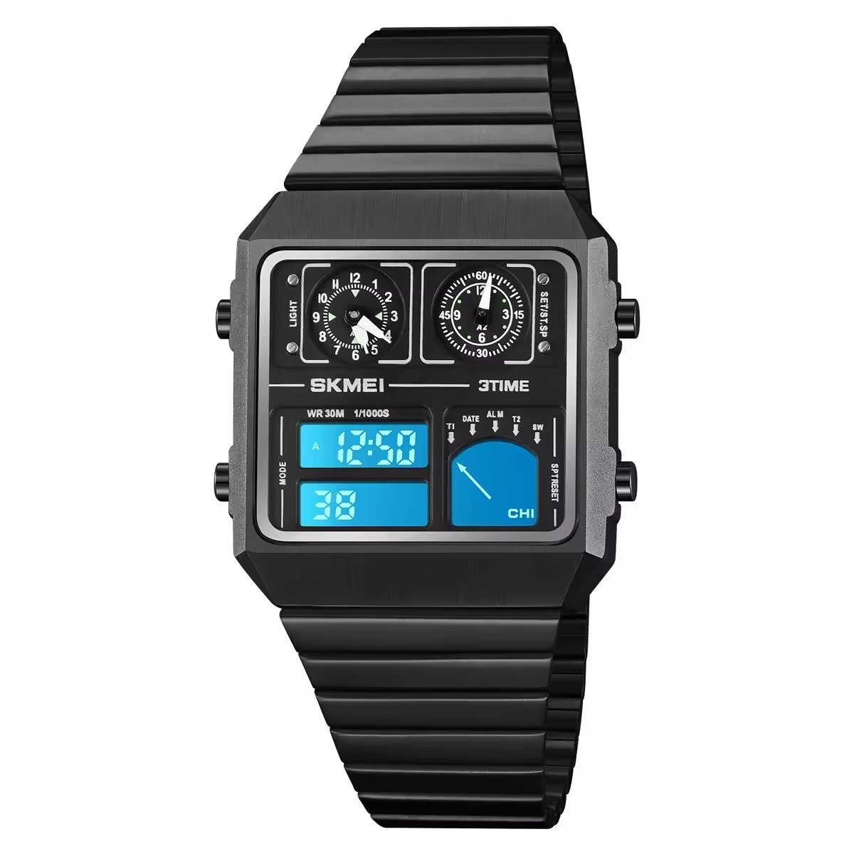 ⌚ SKMEI 2198 – Analog + Digital 3 Time Zone Watch ⚙️ Movement: Digital⚖️ Weight: 72.1g🔍 Crystal: Glass🧱 Case: Zinc Alloy🔗 Band: Stainless Steel🔒 Buckle: Stainless Steel💧 Waterproof: 30M📐 Case Size: 34 × 36mm📏 Thickness: 10.2mm📎 Band Width: 24.2mm📏 Watch Length: 212mm ✨ Functions:🕐 3 Time Zones | ⏱️ Chrono | ⏰ Alarm📅 Date & Week | 💡 LED Light🕐 12/24 Hour | 🌡️ Thermometer