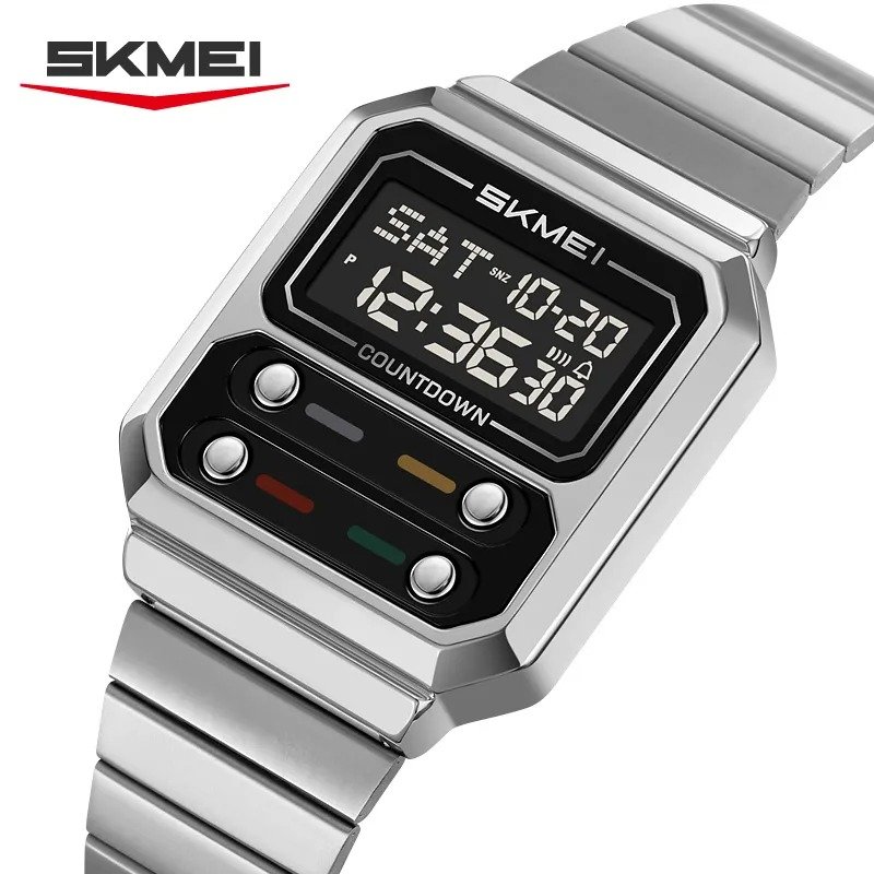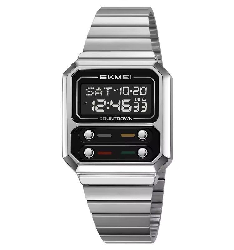 ⌚ SKMEI 2448 – Slim Retro Digital Watch ⚙️ Movement: Digital⚖️ Weight: 75.8g🔍 Crystal: Glass🧱 Case: Zinc Alloy🔗 Band: Stainless Steel🔒 Buckle: Stainless Steel💧 Waterproof: 30M📐 Case Size: 32.3 × 40mm📏 Thickness: 9mm📎 Band Width: 20.7mm📏 Watch Length: 235mm ✨ Functions:🕐 Dual Time (2 Time Zones) | ⏱️ Chrono⏰ Alarm | 📅 Date & Week🔦 EL Light | ⏳ Countdown Timer🕐 12/24 Hour