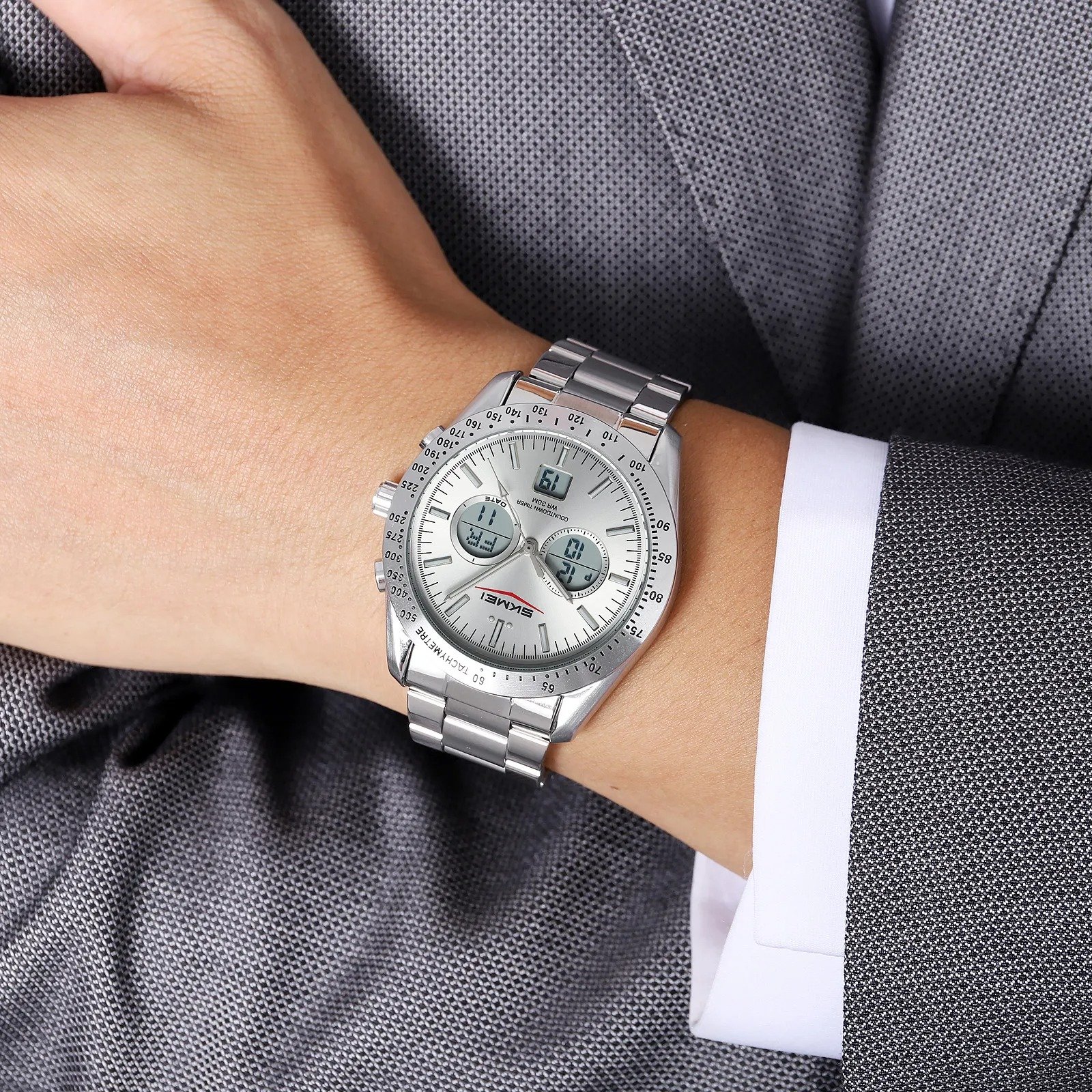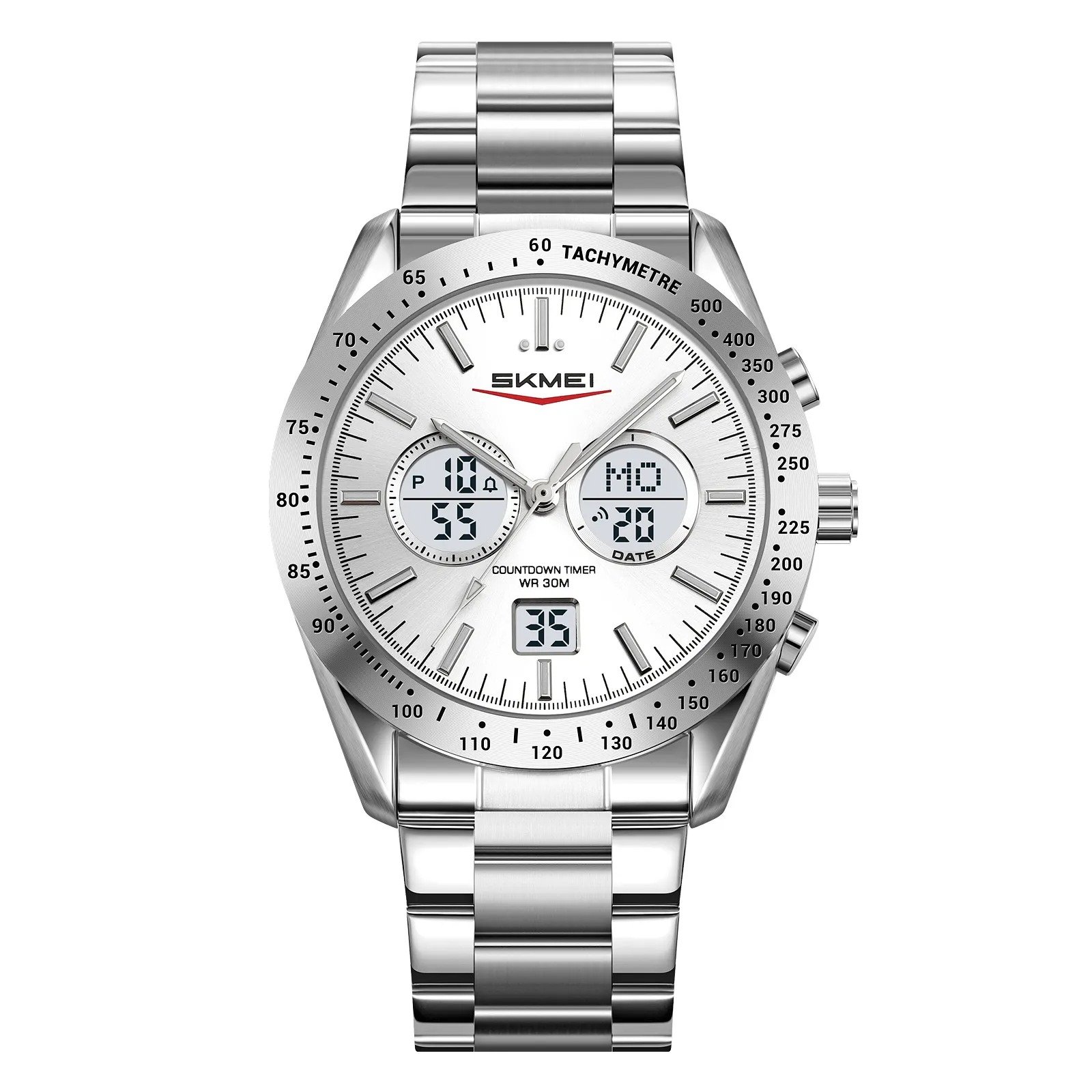 SKMEI 2503 Digital Tachymetre Countdown Timer Watch – silver/silver/white/steel