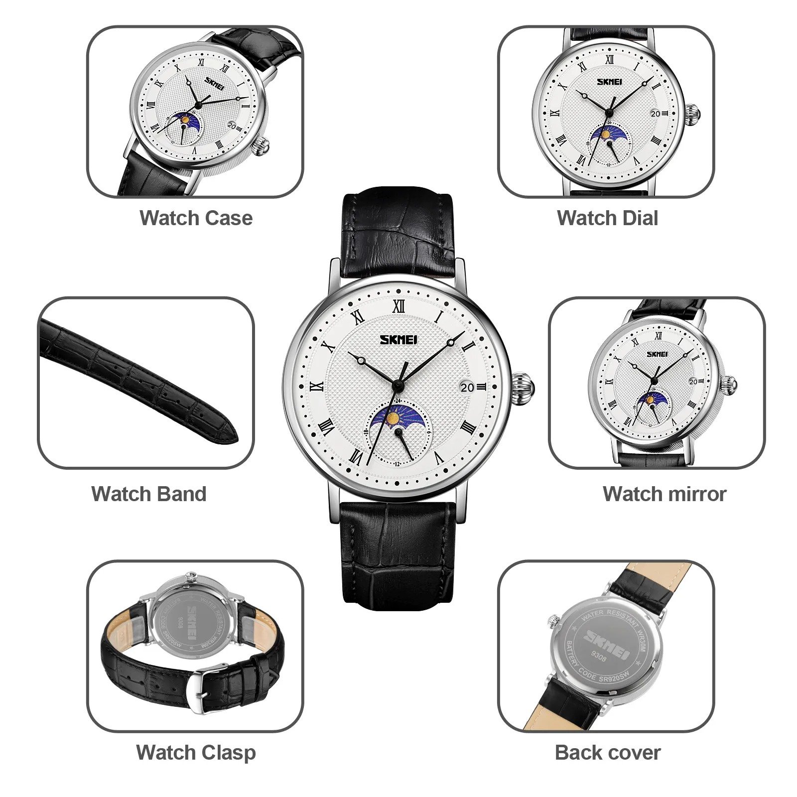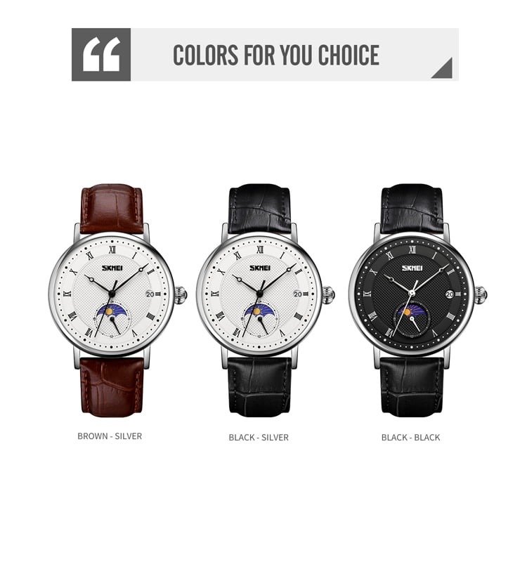 ⌚ SKMEI 9308 – Analog Quartz Moon Phase Watch ⚙️ Movement: Quartz⚖️ Weight: 45g🔍 Crystal: Glass🧱 Case: Zinc Alloy🔗 Band: Leather🔒 Buckle: Stainless Steel💧 Waterproof: 30M📐 Case Size: 40 × 47mm📏 Thickness: 12mm📎 Band Width: 20mm📏 Watch Length: 255mm ✨ Functions:🕐 Time Display | 📅 Date | 🌙 Moon Phase