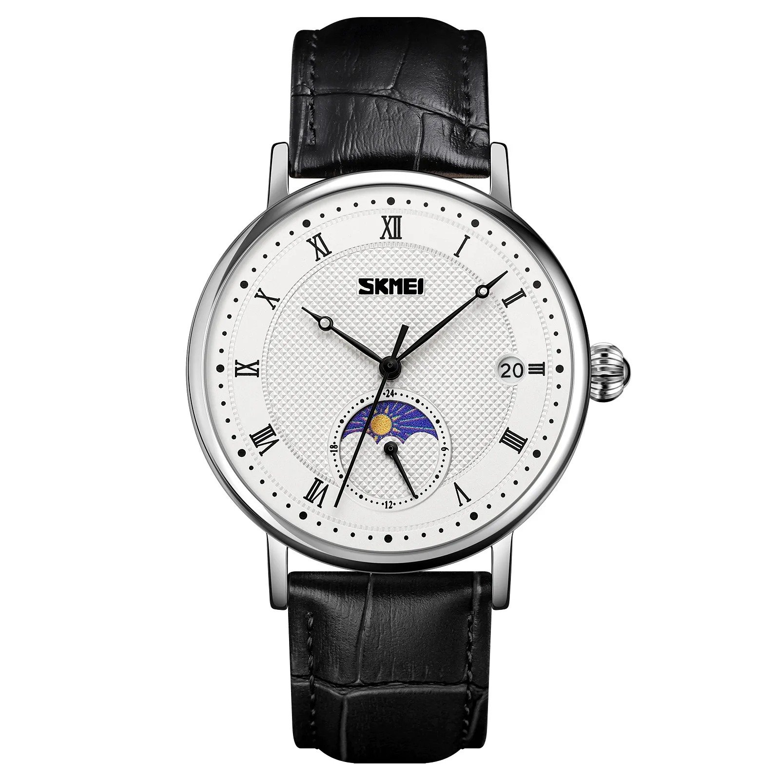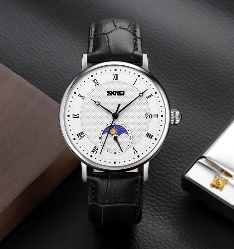 SKMEI 9308 Moon Phase Roman Leather Watch – silver/black