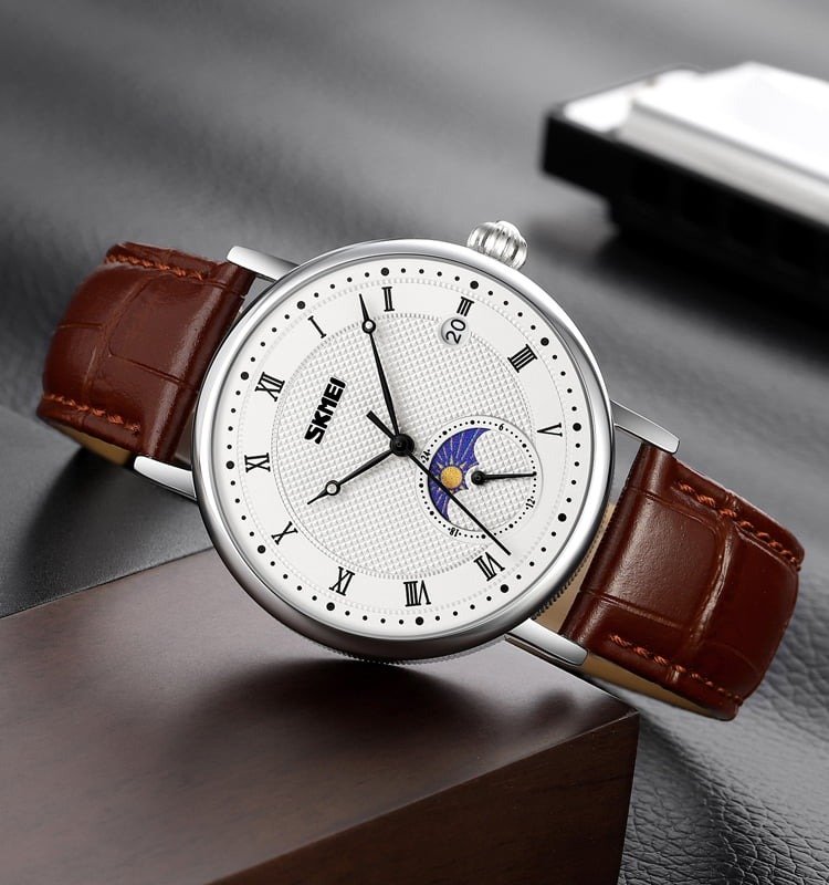 SKMEI 9308 Moon Phase Roman Leather Watch – silver/brown