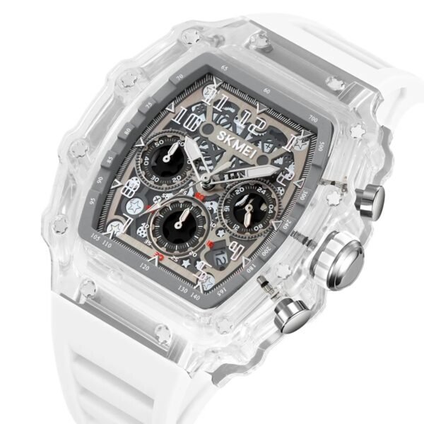 Original price was: ₨ 7,200.₨ 4,990Current price is: ₨ 4,990.SKMEI 2305 Tonneau Skeleton Dial Chronograph Watch – White/Transparent-Yellow