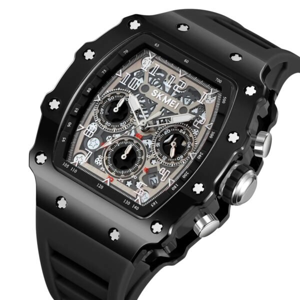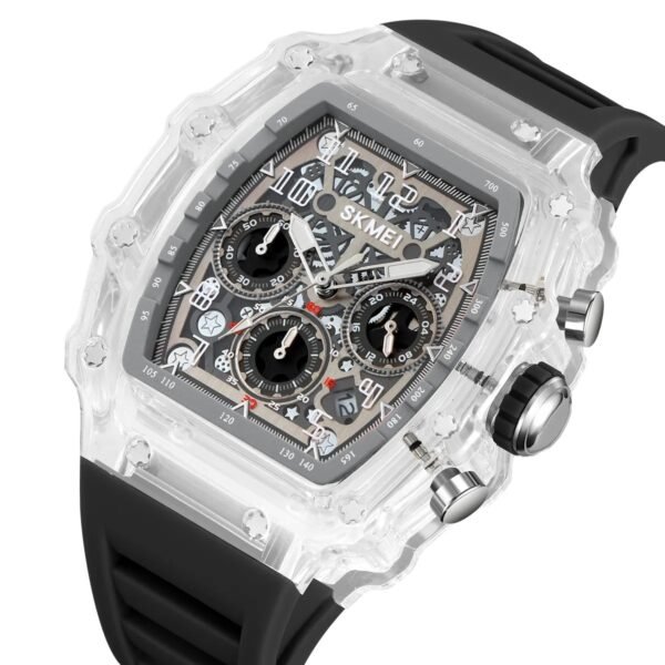 Original price was: ₨ 5,465.₨ 3,734Current price is: ₨ 3,734.SKMEI 2305 Tonneau Skeleton Dial Chronograph Watch – White/Transparent-Black